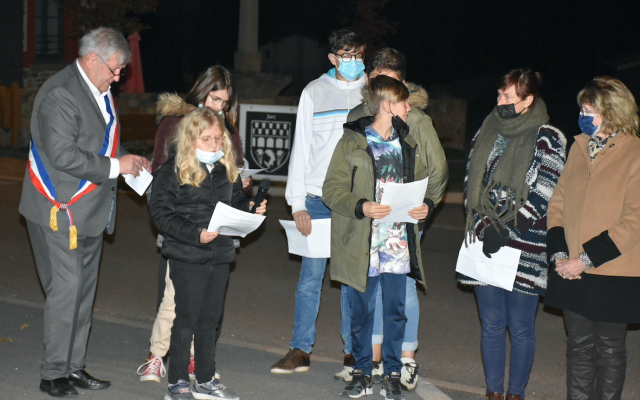 La cérémonie du 11 novembre 2021 a eu lieu vendredi 12 à 18:00. Le Maire et le Conseil municipal étaient présents ainsi que notre Conseillère départemental, Huguette Burelier au milieu de nombreux Juréziens. Surtout, il y avait des enfants de Juré qui avaient souhaité lire des textes en l’honneur de nos Anciens Combattants de Juré. Ces textes, très souvent emprunts d’une grande émotion voulaient être un hommage à nos Anciens et une réflexion sur l’atrocité de cette première guerre mondiale.