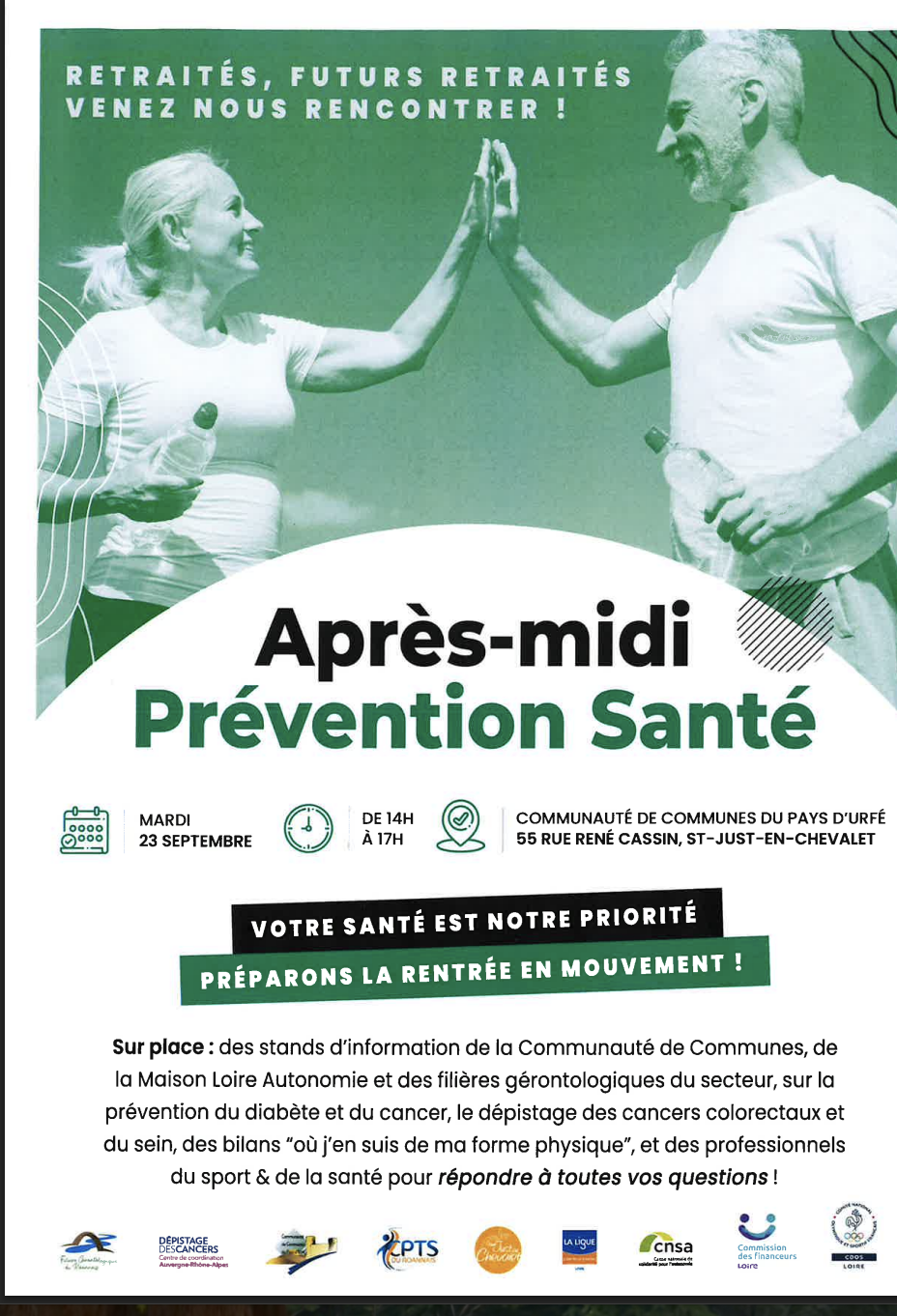 La Communauté de Communes du Pays d’Urfé propose un après-midi consacré à la prévention santé le mardi 23 septembre, de 14h à 17h, au 55 rue René Cassin, à Saint-Just-en-Chevalet.