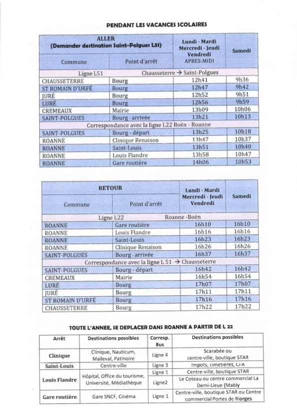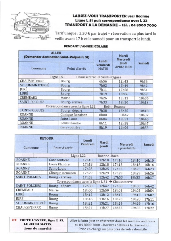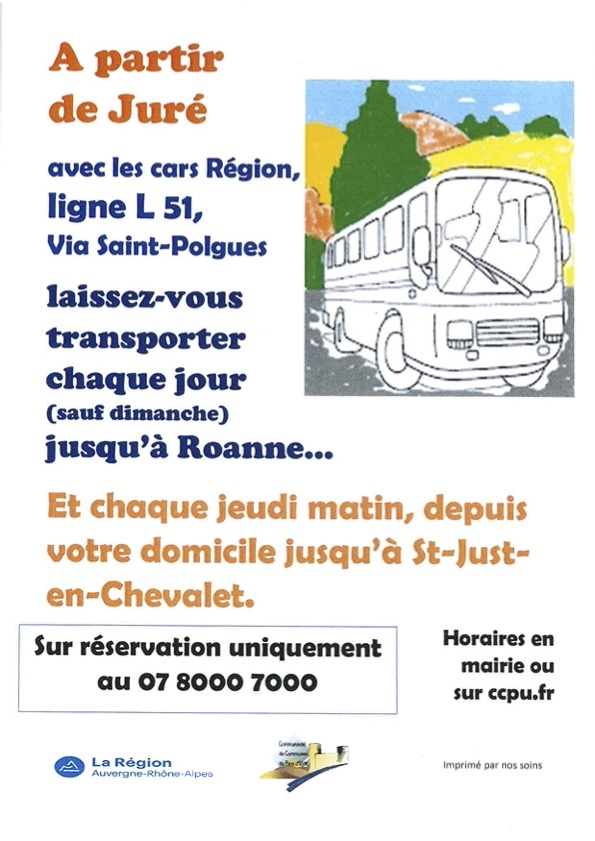 Voici les horaires des cars qui vous permettent d’aller de Juré à Roanne et de revenir à Juré. Il s’agit d’une présentation des horaires simplifiée et plus aisée à lire ! Si vous souhaitez ces horaires sur “papier”, merci de passer en mairie aux heures d’ouverture au public.