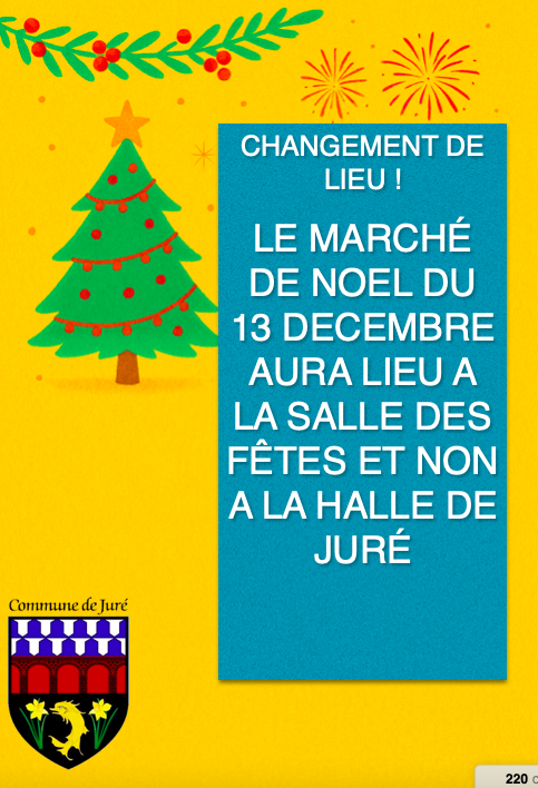 Pour éviter tout risque météo, il a été décidé de changer le lieu du marché de Noël. Il aura lieu à la salle des fêtes de Juré ce samedi 13 décembre de 16h à 20h.