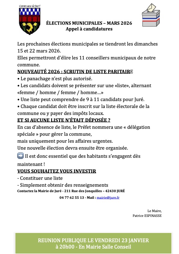 En vue des élections municipales du mois de mars, une réunion publique sera organisée le VENDREDI 23 JANVIER à 20h00 en MAIRIE.