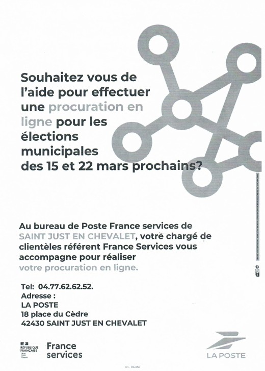 France Services – La Poste 18 place du Cèdre 42430 Saint-Just-en-Chevalet – 04 77 62 62 52