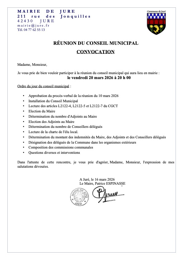 Vendredi 20 mars 2026 à 20h00, séance d’installation du Conseil municipal de Juré  issu des élections du 15 mars 2026.  Ci-dessous l’ordre du jour: