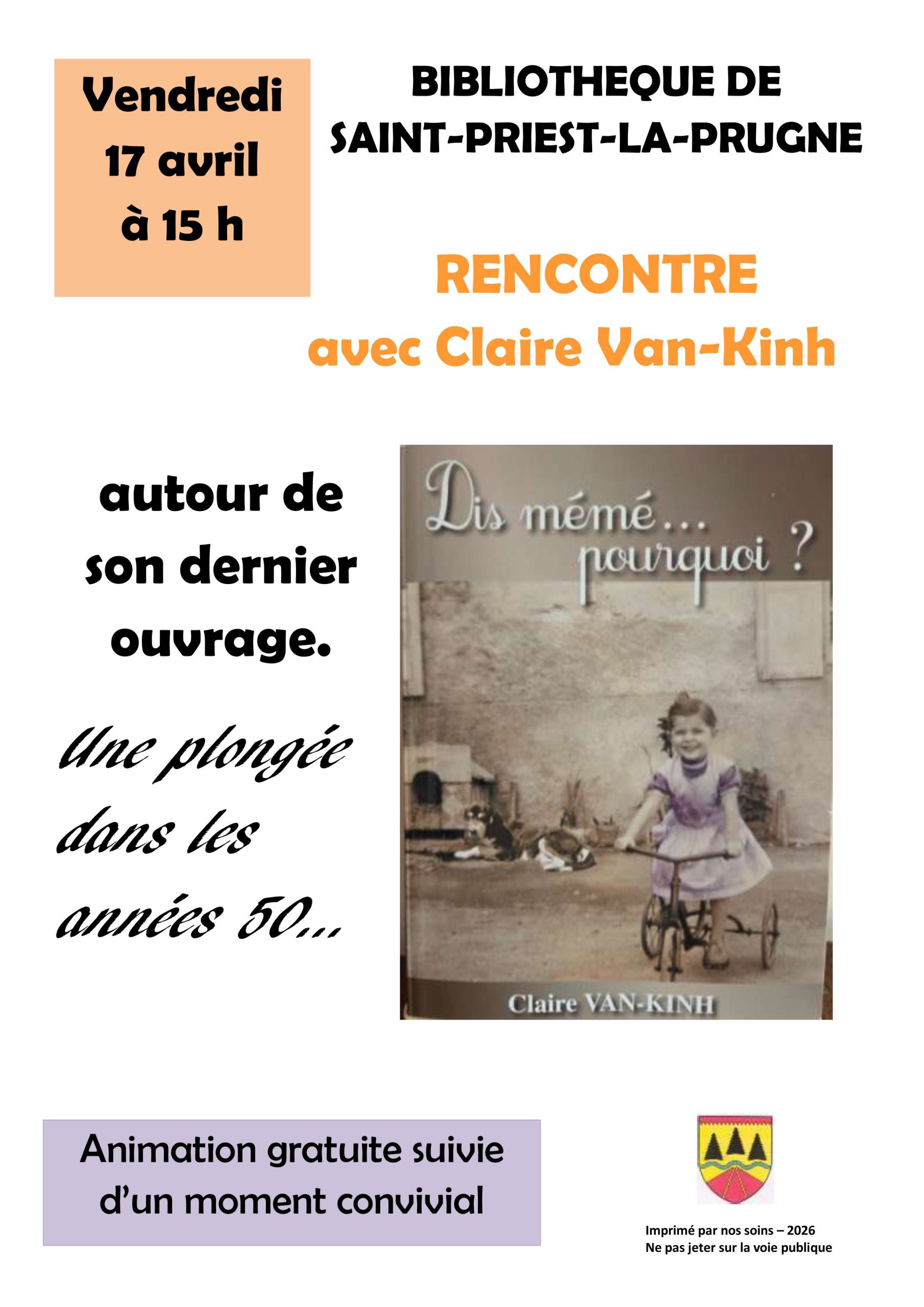 Rencontre avec Claire Van Kinh le vendredi 17 avril 2026 à 15h